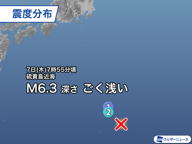 7日(木)7時55分頃、硫黄島近海を震源とするマグニチュード6.3、深さはごく浅いと推定される地震が発生しました。この地震で小笠原村母島で最大震度2、小笠原村父島で震度1を観測しています。