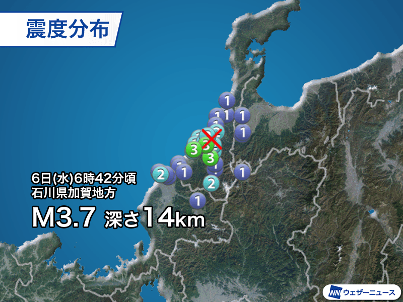 6日(水)6時42分頃、石川県加賀地方を震源とするマグニチュード3.7、深さ14kmと推定される地震が発生しました。