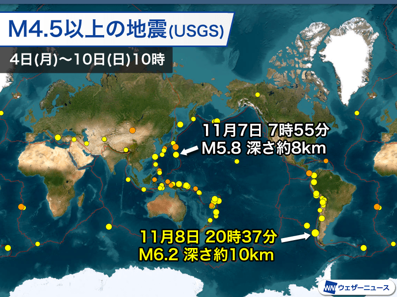 アメリカ地質調査所の解析によるマグニチュード6以上の地震は1回発生しています。最も大きな地震は南米のチリ沖で発生したマグニチュード6.2です。(硫黄島近海の地震はUSGSはマグニチュード5.9と解析)