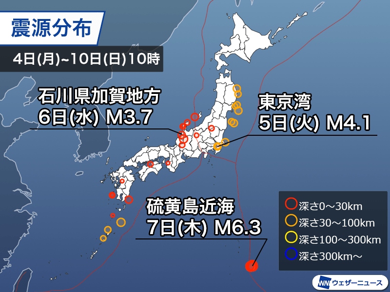 硫黄島近海は太平洋プレートとフィリピン海プレートの境界に位置し、時々大きな地震が起きている領域です。規模の大きな地震は深さ100km以上の深発地震が多く、2000年にはマグニチュード7.9が発生しました。