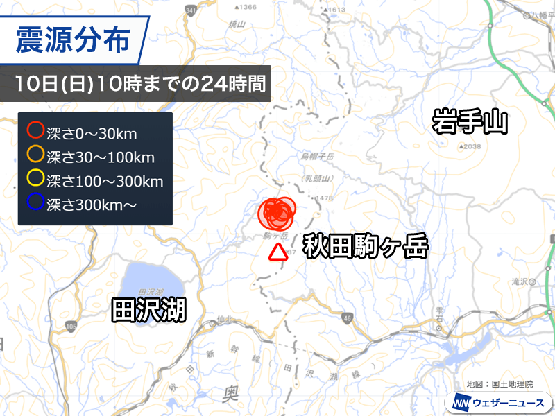 秋田駒ケ岳では今日10日(日)の7時頃から山体の北側で火山性地震が増加しています。火山性地震の震源は男女岳(おなめだけ)から北に3kmほどの所で、深さは約1kmと推定されています。今日7時から9時までに129回(速報値)観測しました。