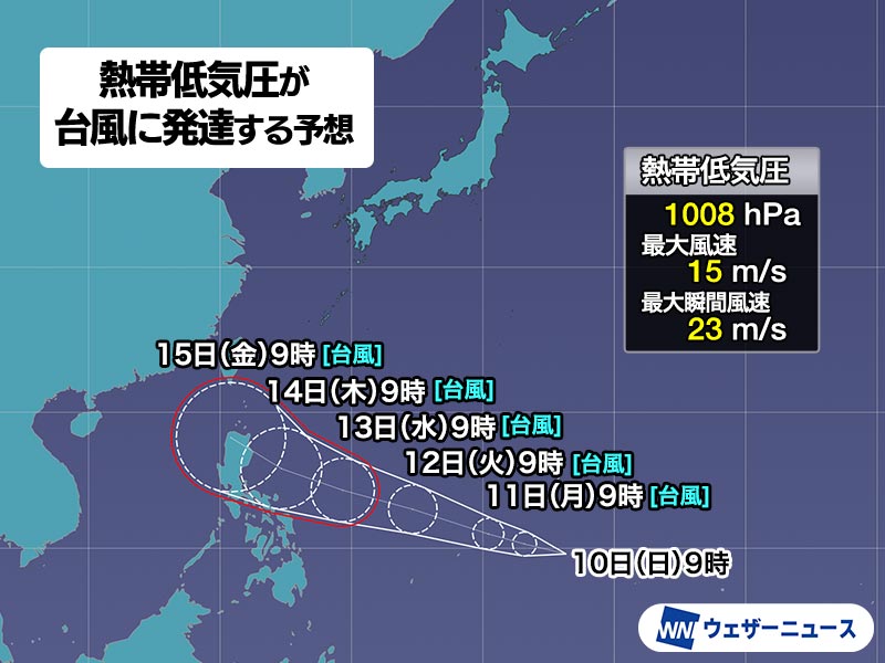 11日(月)には台風となってその後さらに発達しながらフィリピンのルソン島に接近する予想です。進路によっては沖縄地方に影響が出る可能性もあるので、今後の情報に注意してください。
