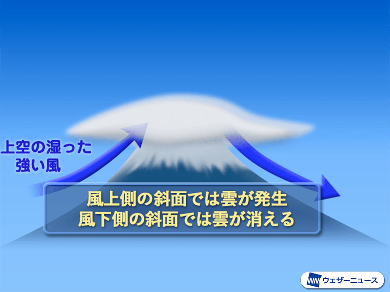 強い風が山にぶつかると両側や上方に風の流れが変わります。湿った空気が山にぶつかって持ち上げられると膨張して冷えることで雲ができ、山頂の風下側では再び空気が下ることで空気が暖まって雲が消える、という原理で山頂付近にだけ雲ができるのです。