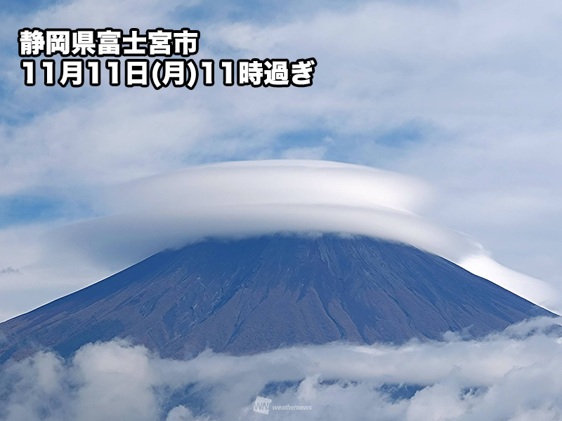 笠雲は富士山のような独立峰の山頂付近に現れる雲です。山が笠を被っているように見えることから笠雲と呼ばれます。