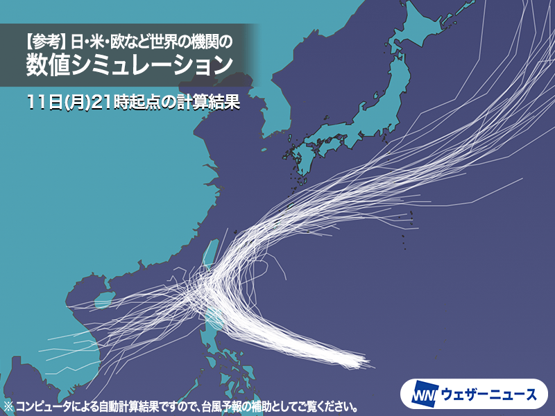 これらを比較すると、フィリピン・ルソン島の北東に達したあとは予想が二分されていて、南シナ海を西進するコースと沖縄付近を東進するコースの真っ二つに割れています。日がたつにつれて誤差は縮小する見込みですので、今後の情報にご注意ください。