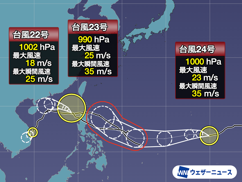 台風22号は南下して勢力を落とし、熱帯低気圧に変わる予想です。今後は日本への影響はありません。