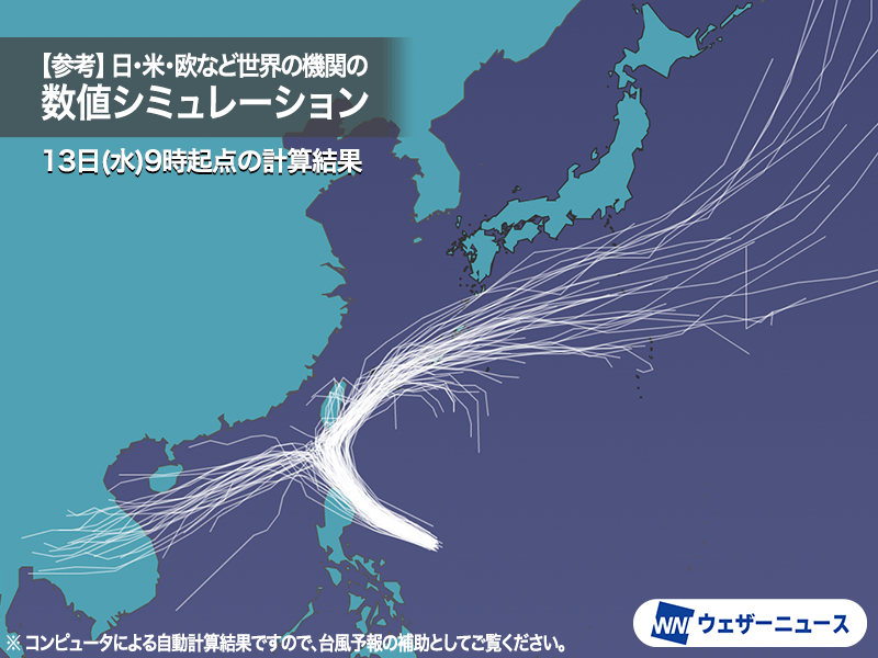 最新の計算結果では東進するものが若干増えたものの、依然として両方の可能性が残っています。
