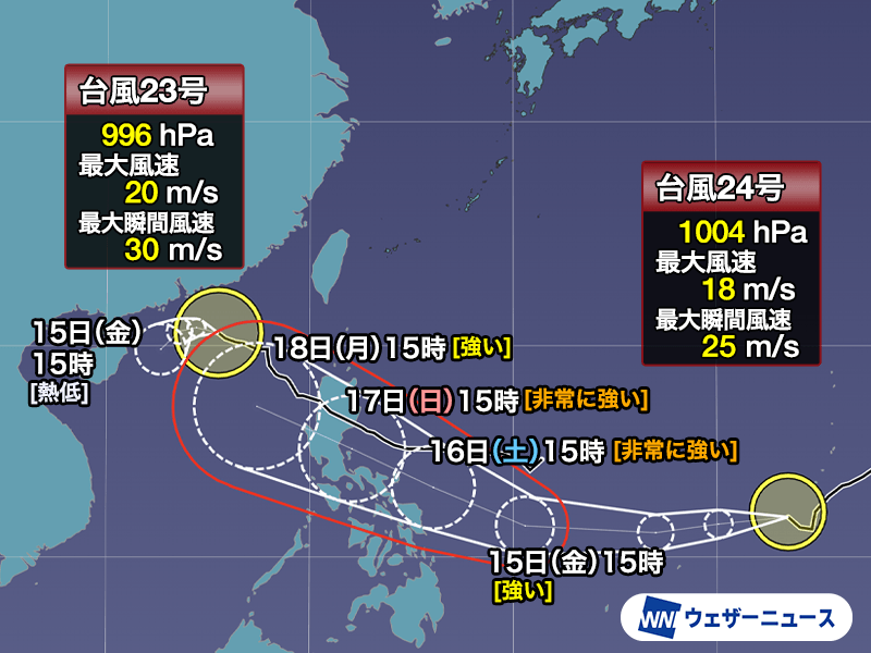 台風24号は25号の後を追うような進路で西に進む予想となっています。明日14日(木)からは湿った空気が供給されやすくなるため急速に発達する見通しです。15日(金)には強い勢力、16日(土)には非常に強い勢力となり、フィリピンのルソン島に近づきます。