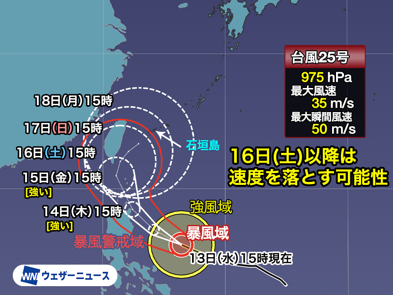 ただ、16日(土)以降は予報円が大きく、進路の不確実性が大きい状況です。速度を落とすとみられ、沖縄・先島への影響が長引くことが考えられます。