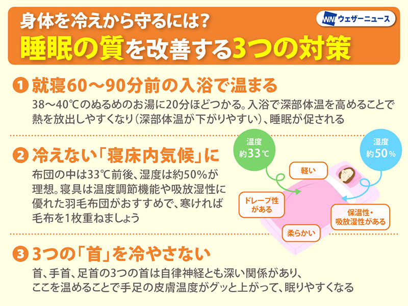 体温のコントロールをよくして睡眠の質を改善するための対策は3つです。