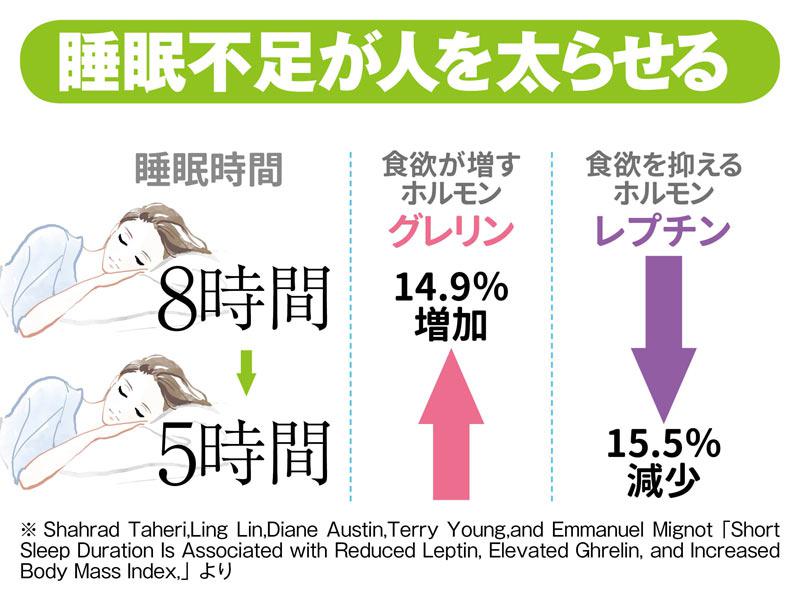 スタンフォード大学の調査で、8時間以上寝ているグループと5時間以下のグループを比べたところ、5時間以下のグループは食べたいという欲求が強くなるホルモン(グレリン)の分泌が14.9%増え、満腹中枢を刺激するホルモン(レプチン)が15.5%減っていました。