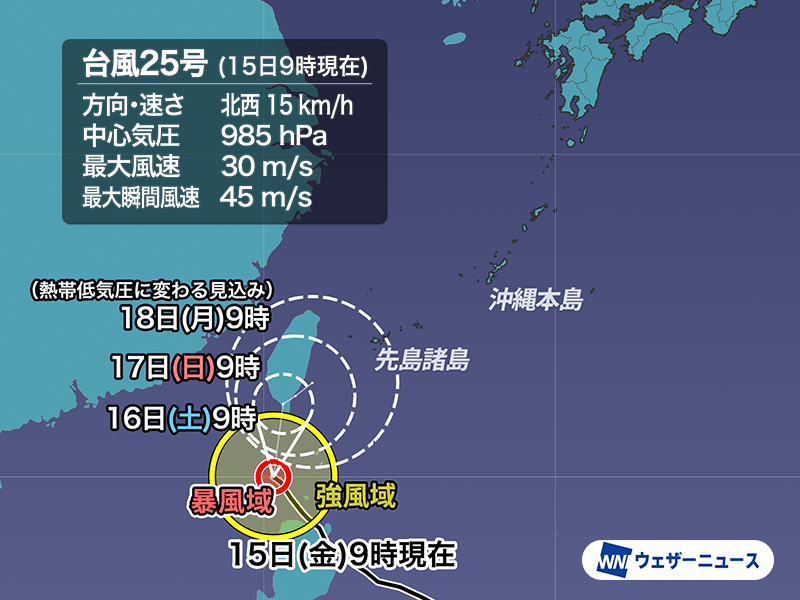 最新の予報では、台湾の南で速度を落として勢力を弱めながら沖縄方面に進み、18日(月)頃に先島諸島の南で熱帯低気圧に変わる見通しです。沖縄には勢力を落としながら接近することになりますが、台風周辺の湿った空気や沖縄付近に停滞する前線の影響で、しばらく雨の降りやすい天気が続くとみています。局地的な雨の強まりに注意してください。