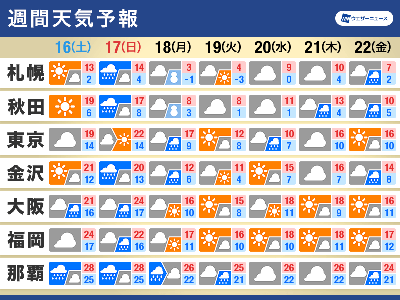 そのほかの地域も18日(月)・19日(火)を中心に気温の下がる所が多くなります。札幌市は週末が14℃に対し、週明けは3℃と、10℃以上の気温低下です。最低気温は氷点下で、暖房が欠かせません。