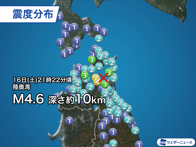 16日(土)21時22分頃、青森県の陸奥湾を震源とするマグニチュード4.6、深さ約10kmと推定される地震が発生しました。この地震で青森県平内町で最大震度4、外ヶ浜町、野辺地町、横浜町、佐井村で震度3を観測しています。
