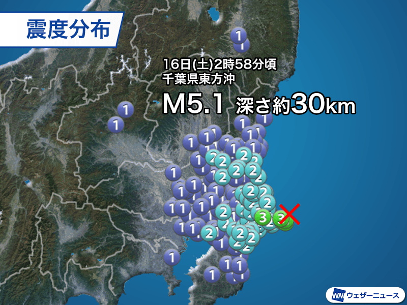16日(土)2時58分頃、千葉県東方沖を震源とするマグニチュード5.1、深さ約30kmと推定される地震が発生しました。この地震で千葉県銚子市、旭市、茨城県神栖市で最大震度3、千葉県北東部から茨城県南部の広い範囲で震度2を観測しています。