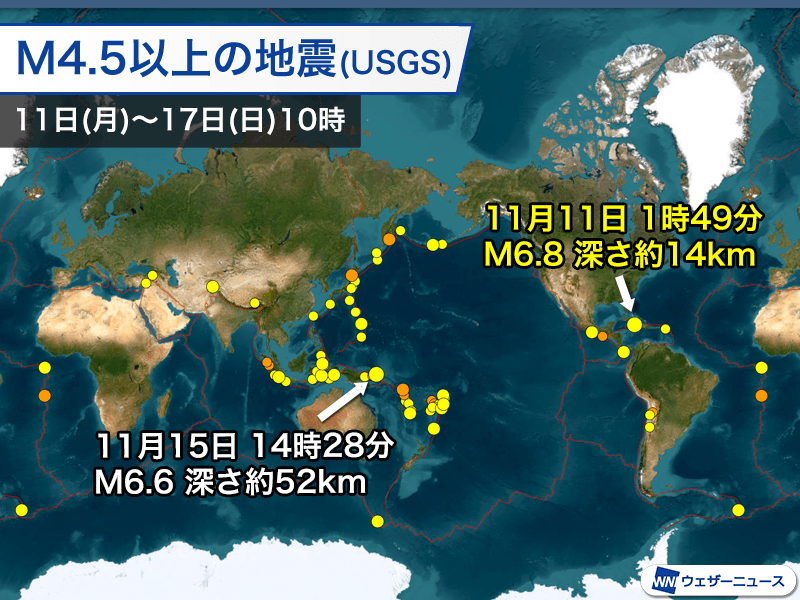 アメリカ地質調査所の解析によるマグニチュード6以上の地震は2回発生しています。最も大きな地震はキューバの南で発生したマグニチュード6.8です。