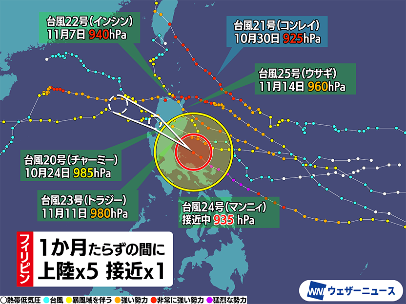 フィリピンのルソン島では10月下旬からの1か月足らずの期間に、暴風域を伴った台風が4つ上陸・1つが接近して、暴風や大雨の被害がでていました。今回の24号は、一連の6つの台風のなかで最も影響が大きくなるおそれがあります。