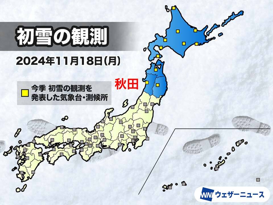 寒気の南下に伴って、東北も北部で雪の範囲が拡大しています。先ほど秋田では初雪が観測されました。平年より3日遅く、昨年より6日早い観測です。これで、東北北部は全地点で初雪が観測されたことになります。