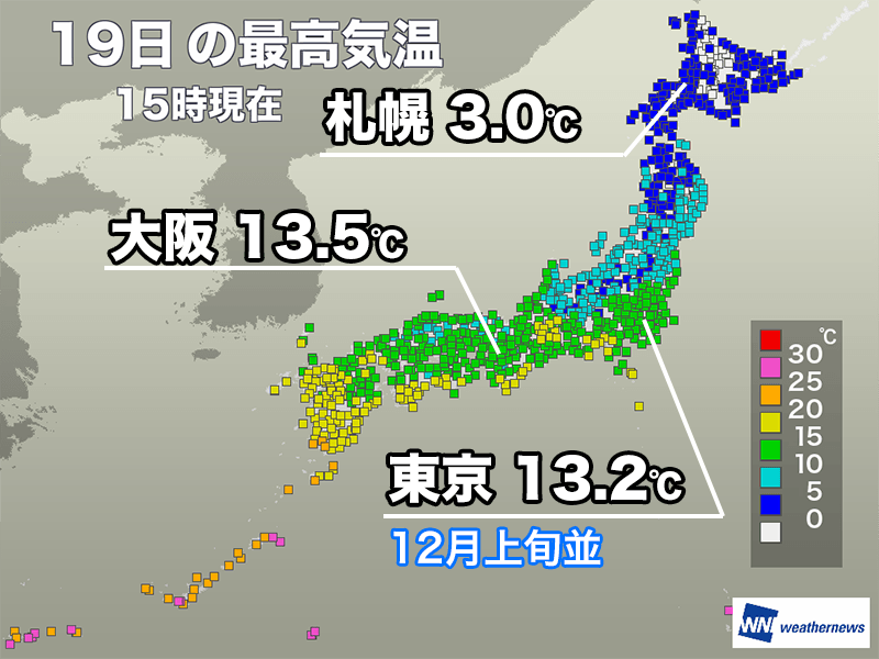 15時までの最高気温は、札幌3.0℃、仙台7.7℃、東京13.2℃、名古屋15.1℃、大阪13.5℃、広島14.3℃です。