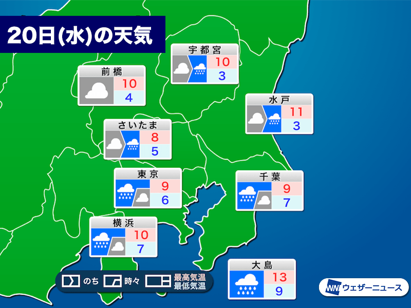 明日20日(水)の関東は厚い雲に覆われ雨が降りやすく、気温がほとんど上がりません。