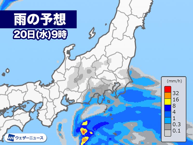 明日20日(水)は伊豆諸島付近で低気圧が発生して北東へ進む予想です。これに伴い、東日本太平洋側は朝から厚い雲に覆われる天気となります。低気圧の北側に広がる雨雲により、静岡県や関東南部では午前中のうちに雨の降り出す所が多くなります。上空には寒気が残り、冷たい雨になる見込みです。