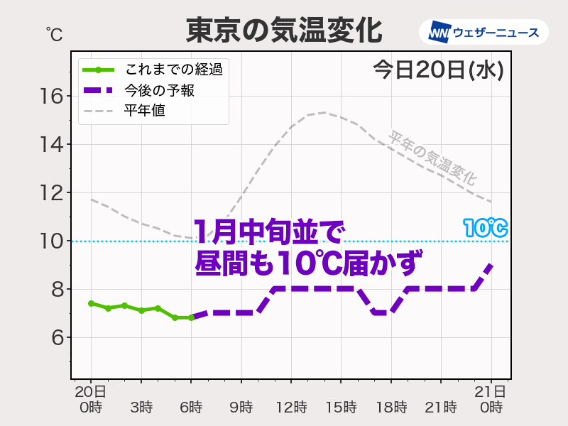 予想最高気温は、東京都心や横浜、千葉など関東南部では10℃に届かず、一日を通してひと桁の気温で推移するとみています。これは1月並みの気温で、冷たい風と雨も相まって各地で気温の数値よりもさらに寒く感じられそうです。