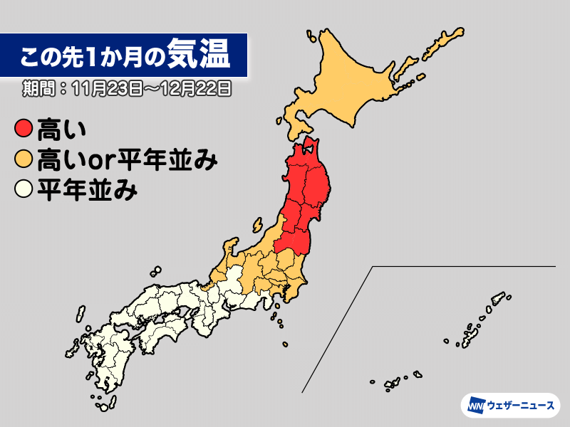 この先1か月は日本の東で低気圧が発達しやすくなるとみられます。大陸の高気圧も強いため、日本付近は西と東の気圧差が大きくなって冬型の気圧配置の強まることがある見込みです。11月前半までに比べると寒気の影響を受けやすく、高温傾向は少し落ち着きます。