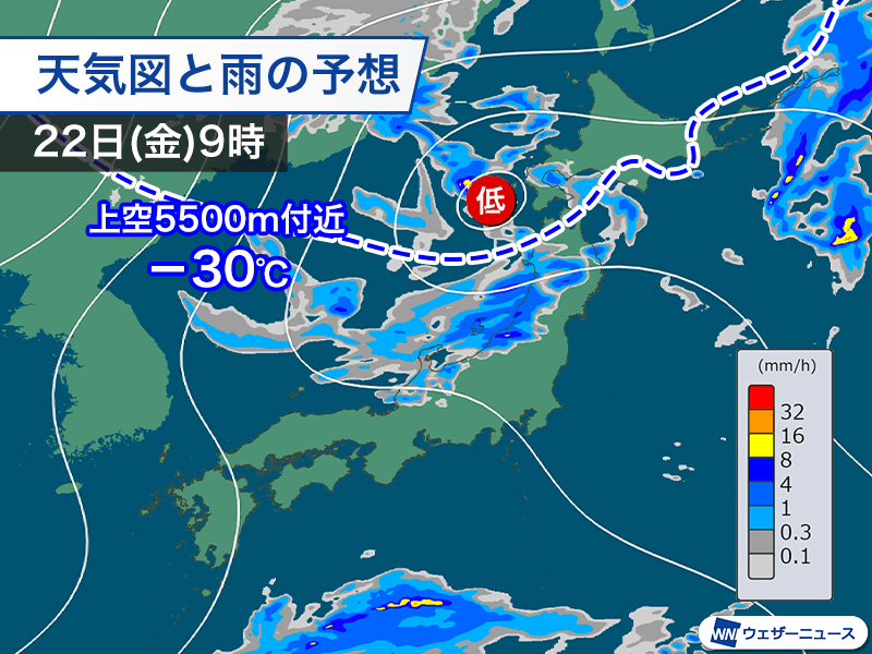 明日は日本海北部を低気圧が進み、北日本に近づきます。低気圧は上空5500m付近に−30℃以下の寒気を伴っていて、周辺では大気の状態が不安定になる見込みです。
