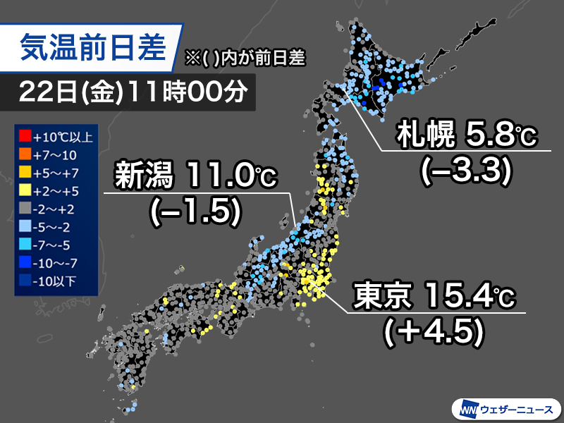 一方で天気が崩れている北海道や北陸などは昨日に比べると気温が低く、新潟市は1.5℃低い11.0℃、札幌市は3.3℃低い5.8℃しかありません。午後も雨が断続的に降り、風も強まりますので寒さが増してきます。しっかりと防寒をしてお過ごしください。