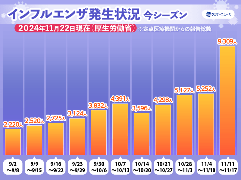 また、インフルエンザによる学年閉鎖や学級閉鎖などの対応をとっている学校も前週から2倍以上に増加しています。