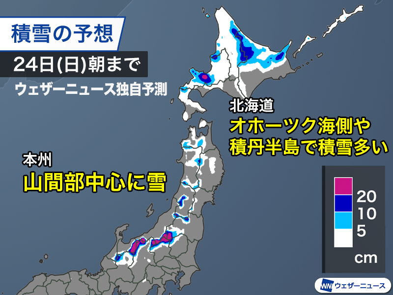 北海道の積丹半島やオホーツク海側の内陸部で5〜10cm、関東甲信や北陸の高い山では30cm以上の積雪が予想されます。
