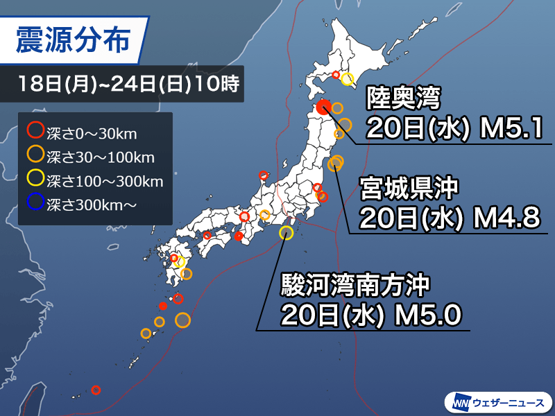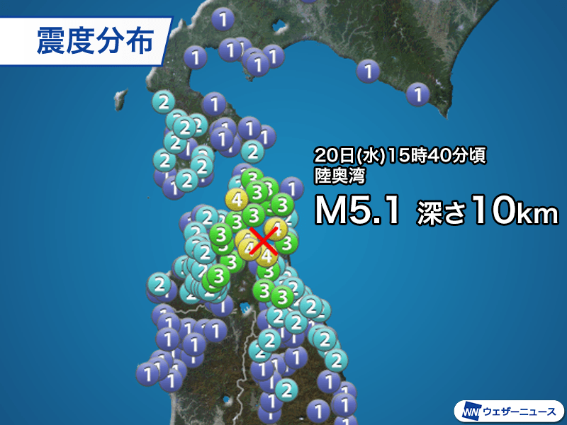 20日(水)15時40分頃、青森県の陸奥湾を震源とするマグニチュード5.1、深さ10kmと推定される地震が発生しました。この地震で青森県平内町、野辺地町、横浜町、佐井村で最大震度4、青森市、十和田市、むつ市などで震度3を観測しています。