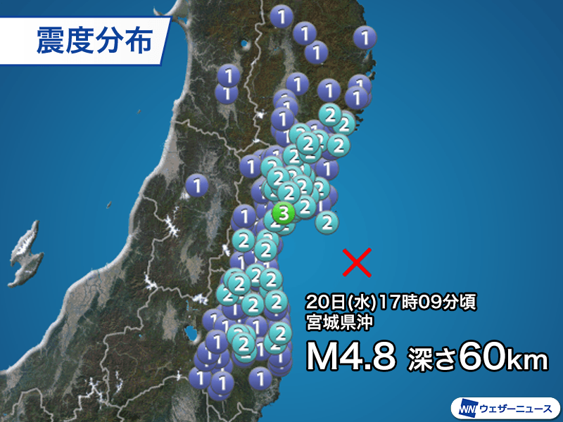 20日(水)17時09分頃、宮城県沖を震源とするマグニチュード4.8、深さ60kmと推定される地震が発生しました。この地震で宮城県松島町で最大震度3、岩手県南部から宮城県、福島県にかけて震度1〜2の揺れを観測しています。
