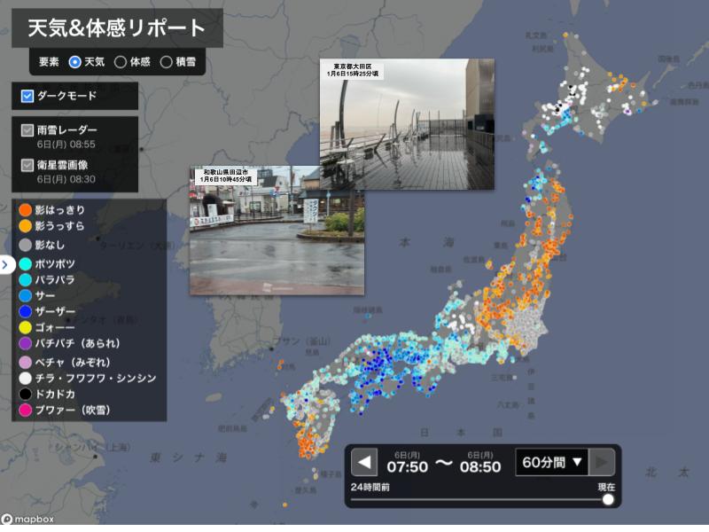 ウェザーニュース for businessの「天気&体感リポート」でも、西日本を中心に雨が強まっていた様子が確認できます。