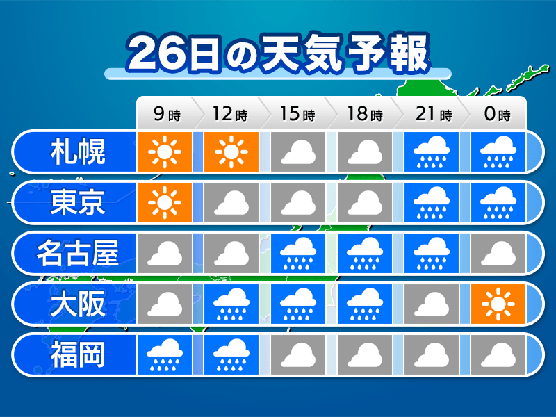 低気圧や前線が今日26日(火)午前中〜明日27日(水)明け方にかけて日本列島を通過し、全国的に雨が降り風も強まります。