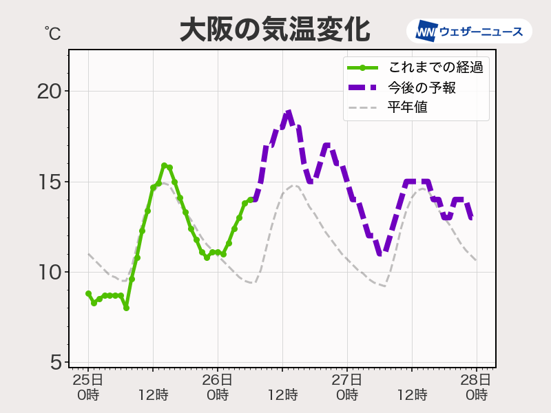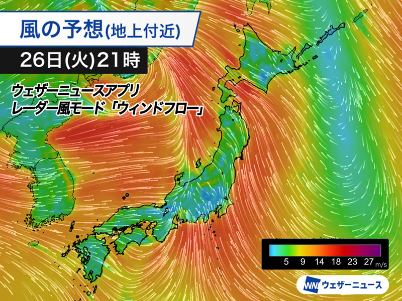 前線が南北に立っているため、前線の通過後は西風になって、強い寒気の流れ込みはないため目立った気温の低下もない予想です。東日本や北日本では明日27日(水)は、天気の回復次第でかなり暖かくなる可能性があります。