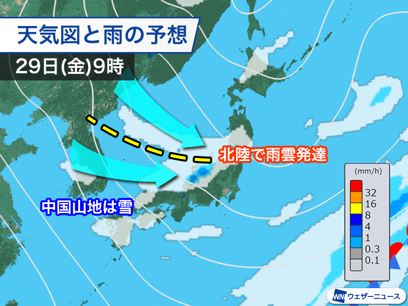 また、寒気の影響で大気の状態が不安定になり、日本海側の広い範囲で雨雲が発生、発達しやすくなります。午後は局地的に雨が強く降り、雷や突風、霰(あられ)などを伴うおそれがあるため注意が必要です。
