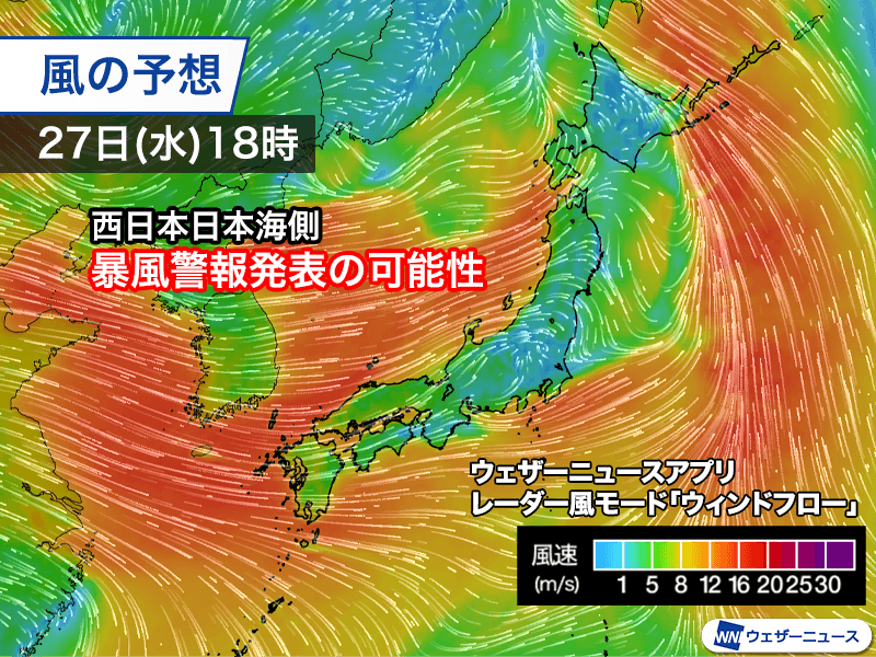 西日本の沿岸部では次第に風が強まり、午後は東シナ海から対馬海峡、山陰沖で平均20m/sを超えるような強風が予想されます。九州北部や山口県では暴風警報が発表される可能性が高く、北陸や東北を含むそのほかの日本海沿岸でも瞬間的には20〜30m/sの風が吹く見通しです。
