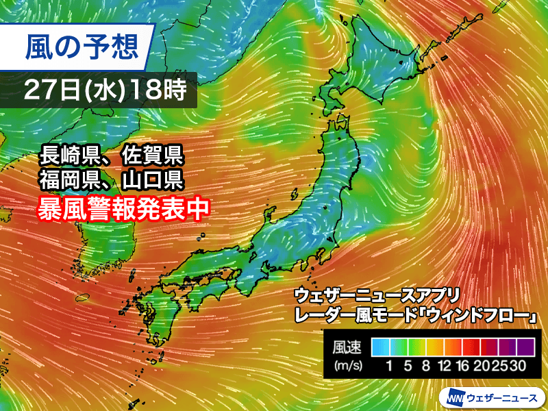 特に九州北部から中国地方にかけての沿岸部で風が強まるとみられ、すでに長崎県、佐賀県、福岡県、山口県には暴風警報が発表されています。瞬間的には25m/sを超えるような暴風の可能性があるため、飛来物や交通機関の乱れなどに警戒が必要です。