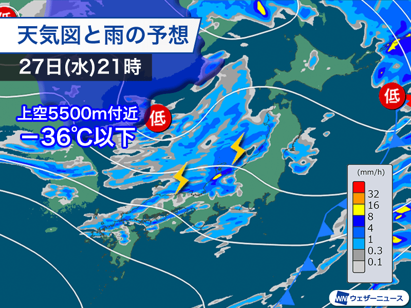 各地に激しい雨を降らせた低気圧や前線は東に離れ、日本付近は冬型の気圧配置になってきました。大陸には上空5500m付近で−36℃以下の強い寒気が控えていて、寒気の東から南側にかけては大気の状態が非常に不安定で、雨雲が発達しやすくなる見込みです。