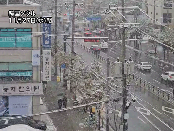 上空5500m付近で−39℃以下の強い寒気を伴った低気圧が通過している影響で、韓国ではソウルを含む北部を中心に昨夜から雪が強まっています。ソウルでは昨年に比べて10日遅い初雪になりました。ソウルの初雪は気象観測所で目視により行われています。日本は自動化が進んでいて、目視による観測が継続しているのは東京と大阪のみです。