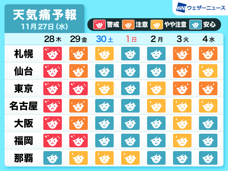 その後も週末にかけて警戒〜注意ランクとなっており、個人差はあるものの頭痛や関節痛などの天気痛の症状が出る可能性があります。痛みや身体の不調がひどくなる前に早めに対策を行ってください。