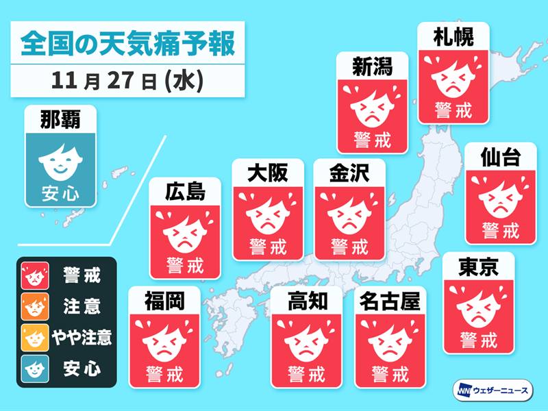 また、毎日決まった時間に起こる「大気潮汐※」と呼ばれる気圧変化の変動も通常より大きいため、ウェザーニュースの天気痛予報では、広い範囲で警戒ランクとなっています。