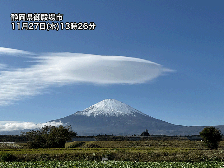この風によって富士山付近では笠雲が形成されています。山頂付近を覆うような笠雲と違い、今日は少し離れた所に現れました。「はなれ笠」と呼ばれ、この雲が出現したときは翌日も晴れることが多いと言われています。実際の予報でも明日28日(木)は大きな天気の崩れがなく、晴天が続く見通しです。