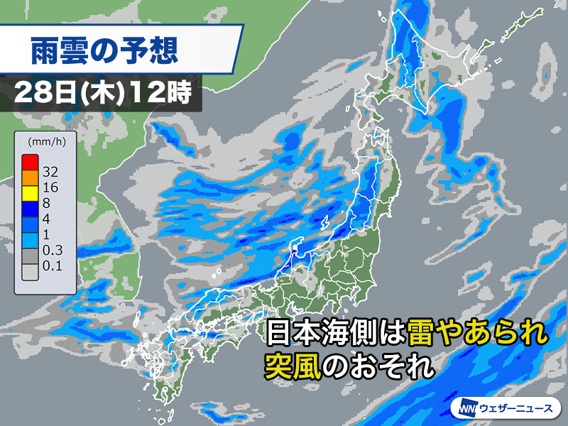 また、東北太平洋側や四国の瀬戸内側でも雨が予想され、関西などにも雨雲が広がる可能性があります。短時間の強雨や落雷、突風、霰に注意をしてください。