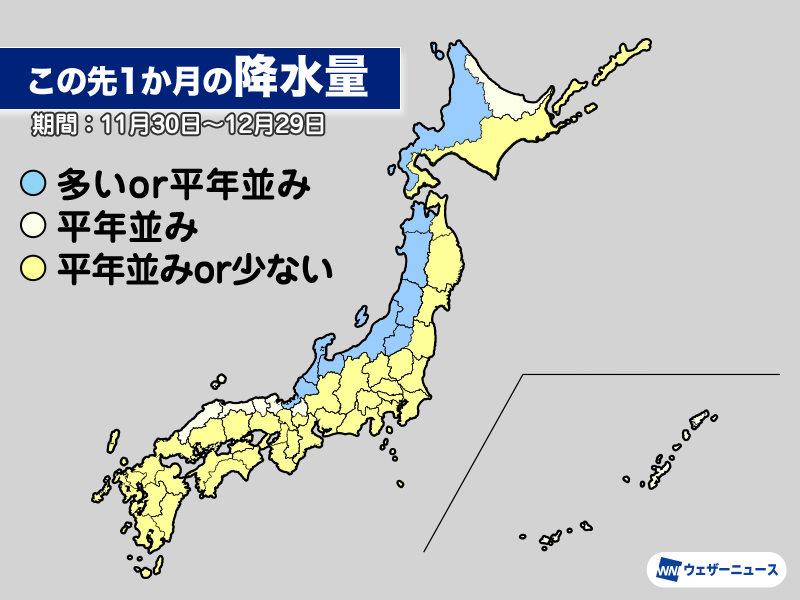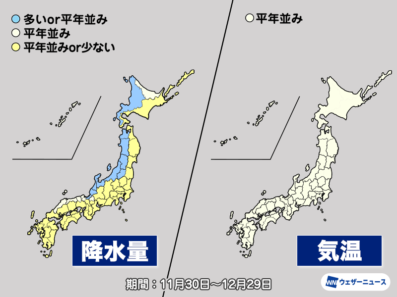 冬型の気圧配置になりやすいため、日本海側では雪や雨の日が多い見通しです。北日本日本海側や北陸の1か月の降水量・降雪量は、平年並みか平年より多い予想になっています。