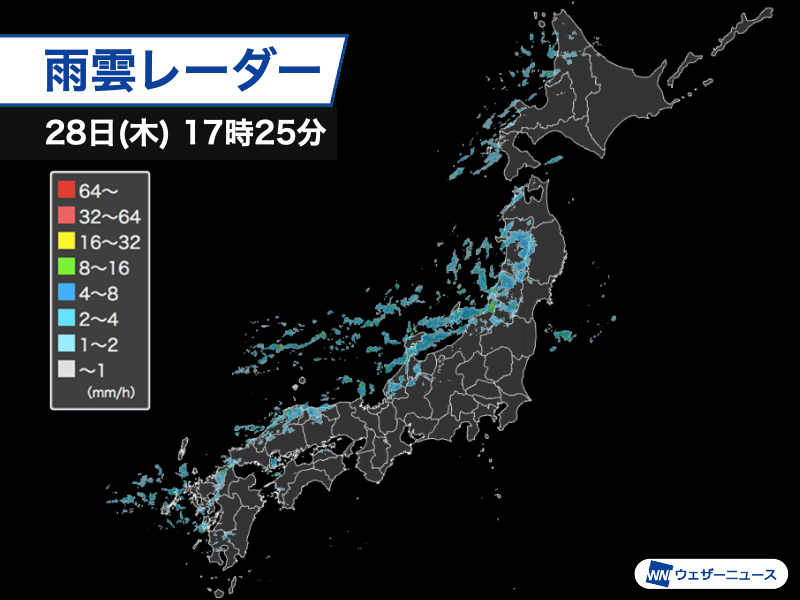 今日28日(木)は西回りで寒気が流れ込み、東北から九州の日本海側を中心に雨が降っています。上空1500m付近の寒気は強くないものの、5500m付近の寒気は強く、大気の状態が不安定になって雨雲が発達している状況です。