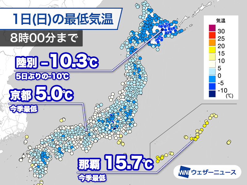 また、沖縄や奄美では各地で12月下旬〜1月並みの冷え込みとなり、一年の最も寒い時期の平年値を下回る真冬並みの寒さとなった所もありました。
