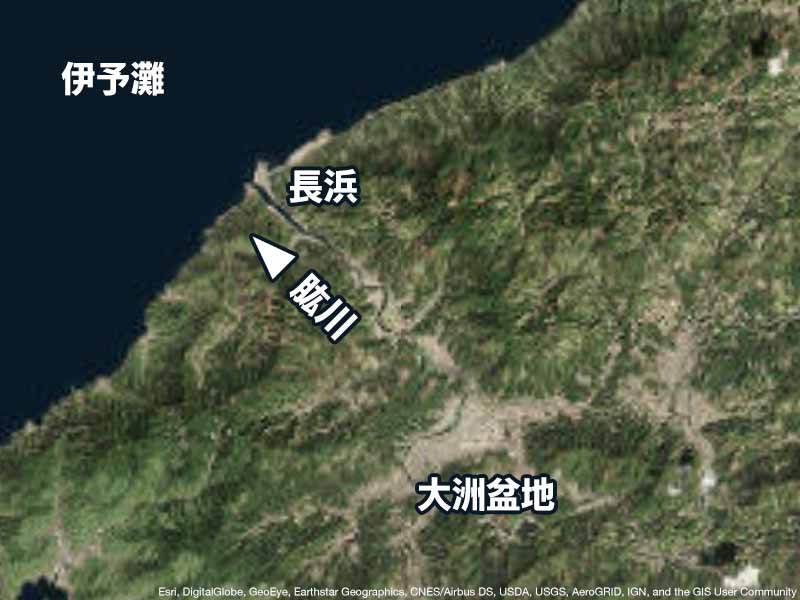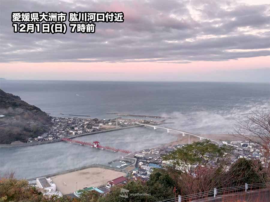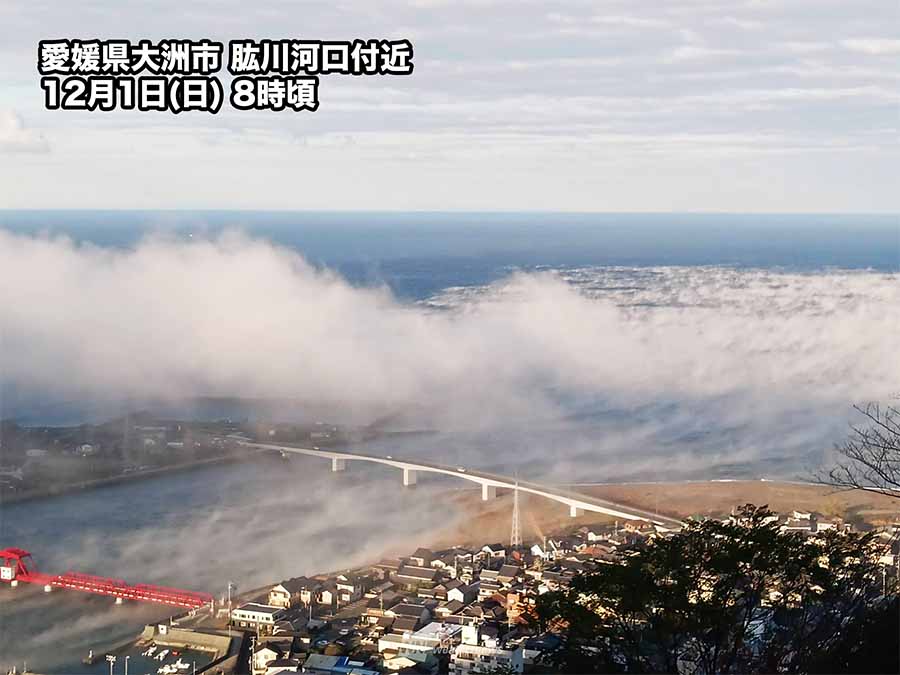 今朝は河口近くの「肱川あらし展望公園」から川を下る川霧がはっきりと観測されました。上流の大洲盆地に位置するアメダス大洲では最大瞬間風速が2.5m/sと弱いものの、肱川河口のアメダス長浜では肱川あらしの影響で最大瞬間風速12.7m/sが観測されています。
