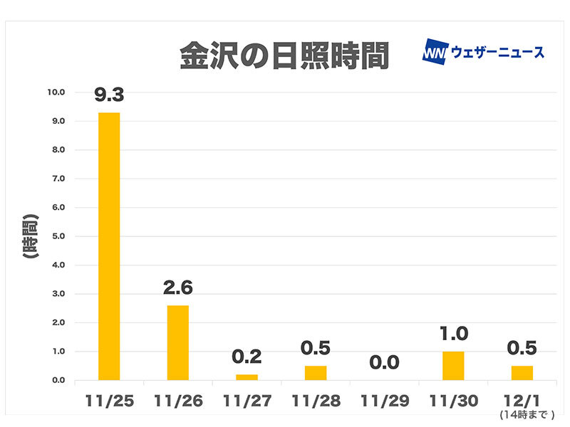 師走スタートの今日1日(日)も金沢の日照時間は14時まででわずか0.5時間にとどまっています。